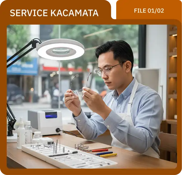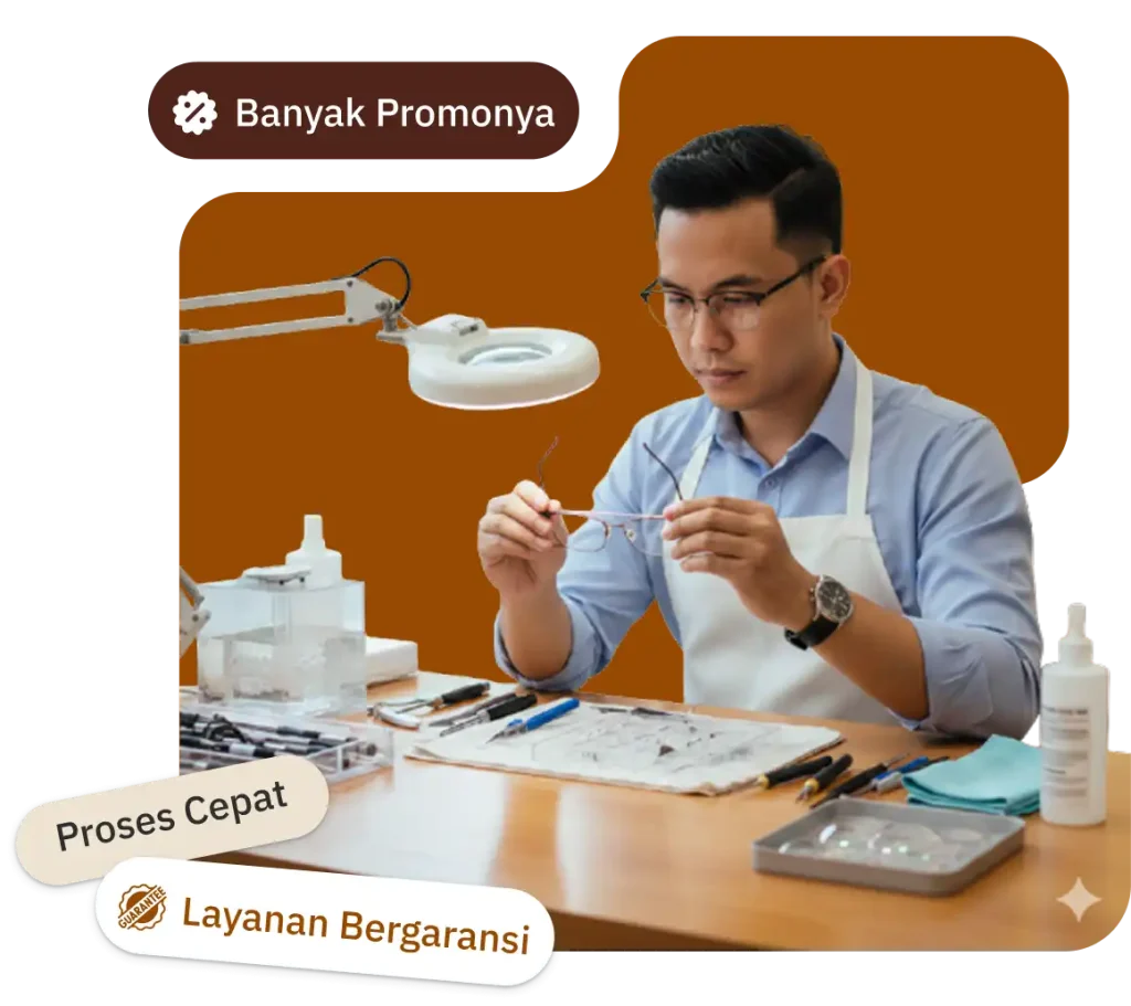 Kami melayani berbagai perbaikan kacamata mulai dari baut lepas, frame longgar, engsel rusak, hingga patah ringan. Setiap pengerjaan dilakukan dengan teliti dan presisi agar kacamata kembali nyaman digunakan seperti baru.